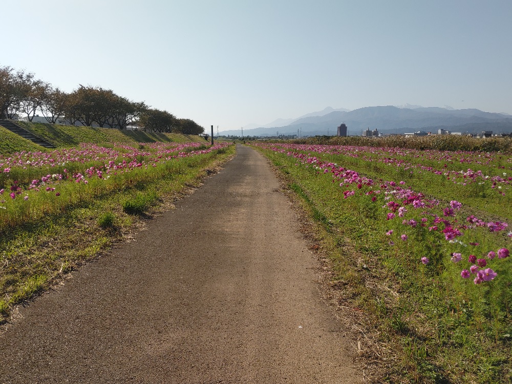 毎年9月から11月に関川大橋の河川敷にコスモス畑が現れます。
