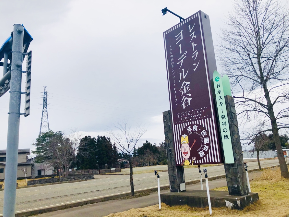 山麓線沿いを車で走ると、レルヒさんのイラストとともに「レストラン・ヨーデル金谷」の看板が見えます。