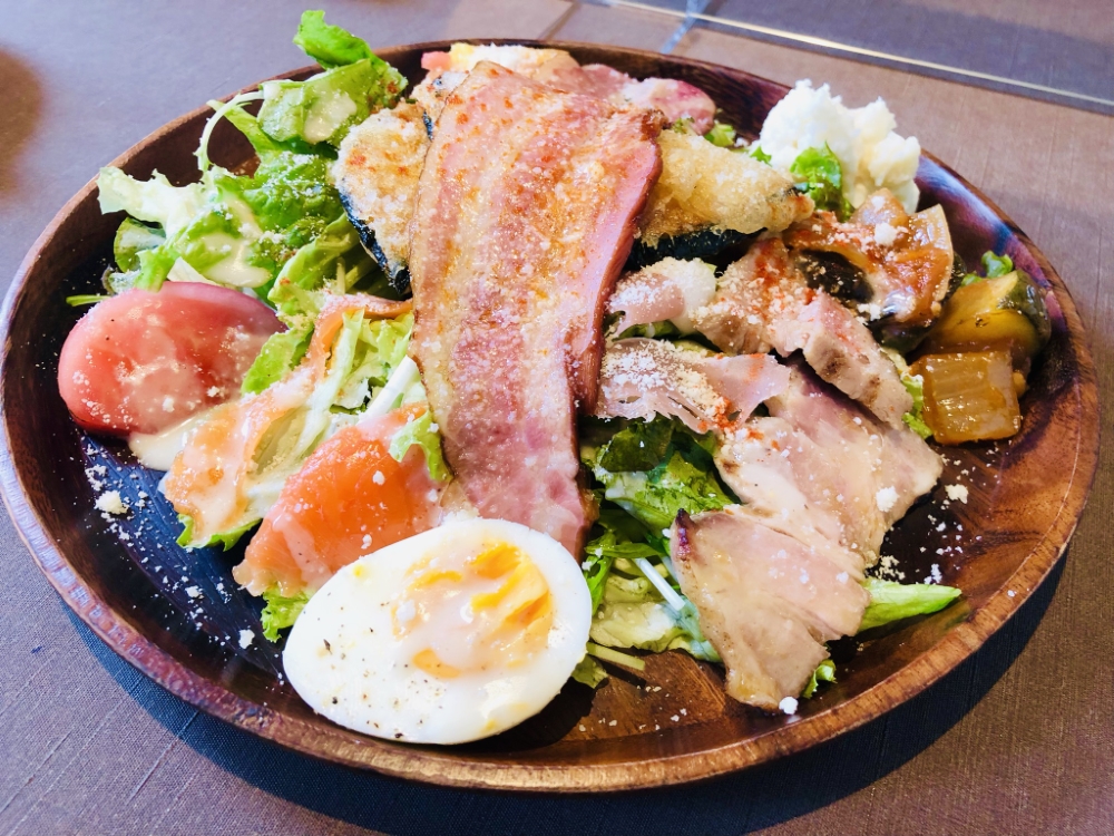 たっぷりの野菜に、皿の直径ほどある大きなベーコン、かぼちゃのフリット、ラタトゥーユ、キッシュ、生ハム、スモークサーモンなどが乗っていました。