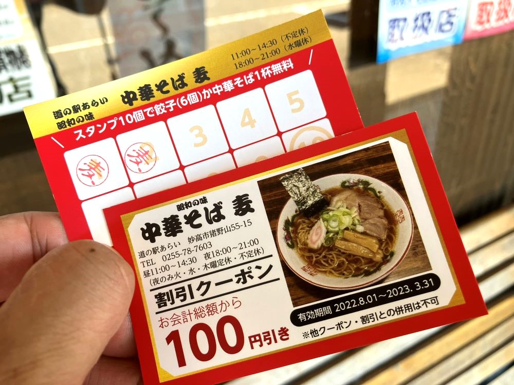 1枚は次回お会計時に使える100円のクーポン券。もう一枚は10個ためると餃子か中華そばが無料になるスタンプカードです。