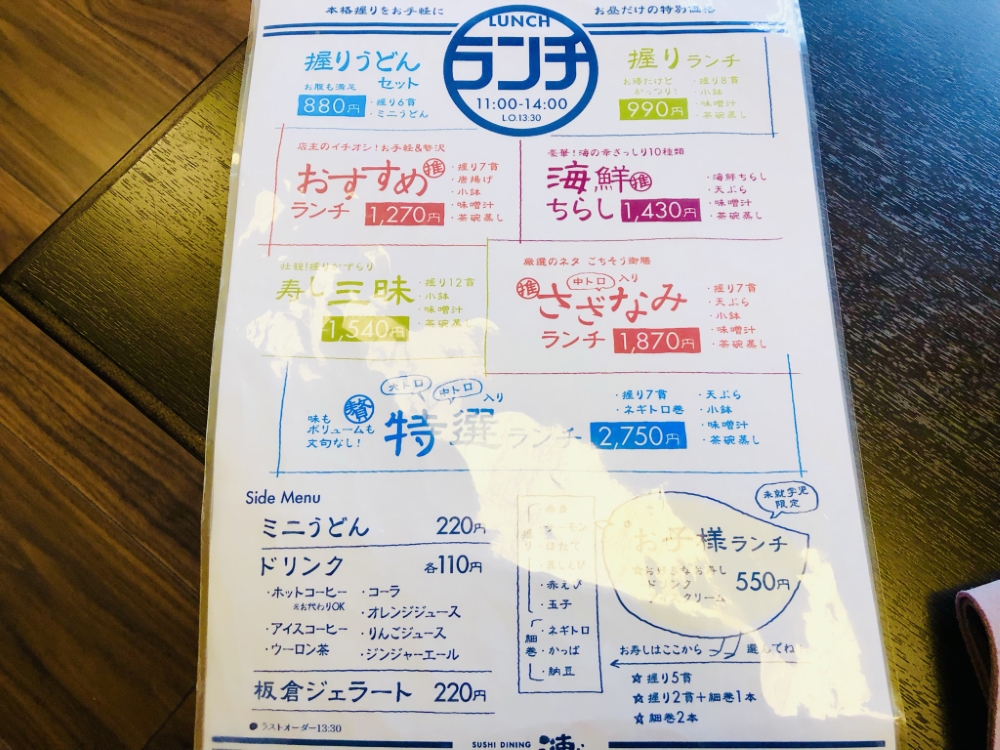 「SUSHI DINING 漣(さざなみ)」さんのランチメニューは、お手頃な価格で本格的なお寿司を味わうことができます。