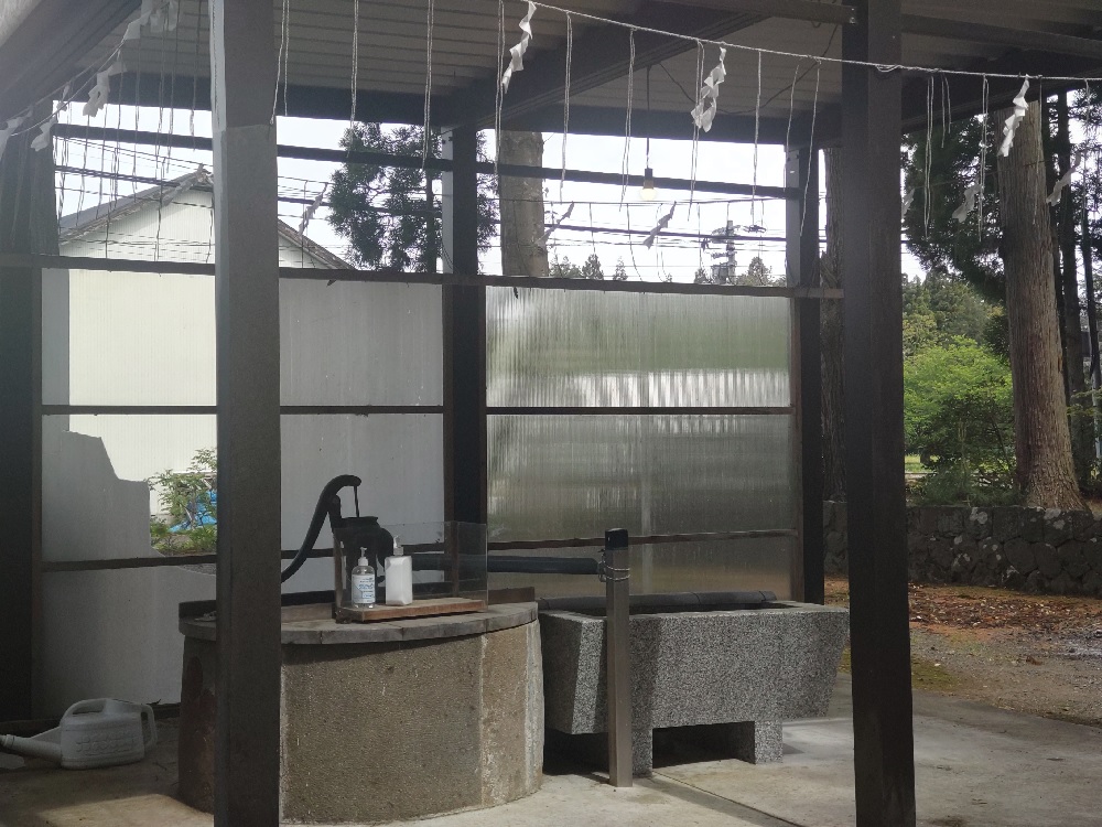 お社の前には手水舎がありますが、現在はお水が出ていないのでアルコール消毒をするようになっています。