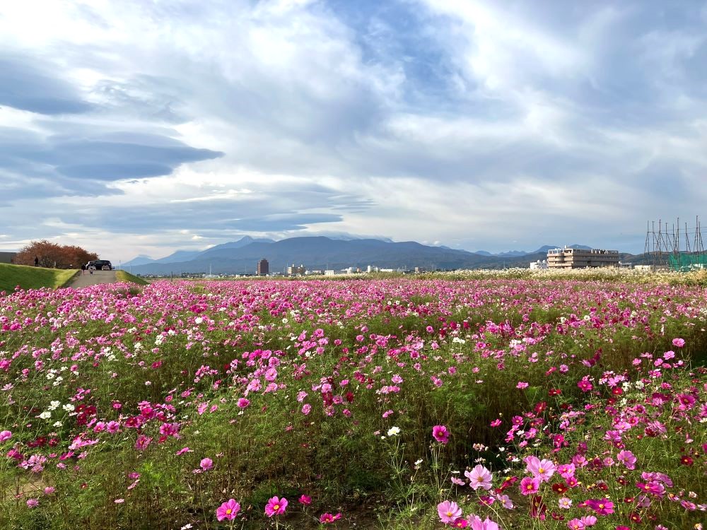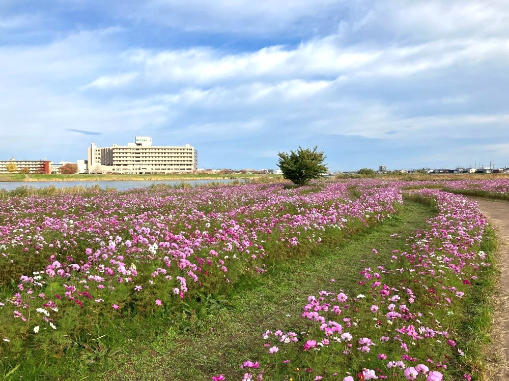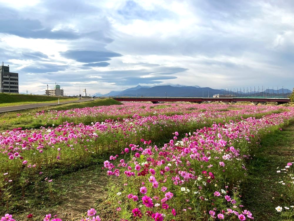 上越市の中心を流れる関川のほとりには、毎年9月から11月にコスモスがじゅうたんのように咲き広がる河川敷があります。