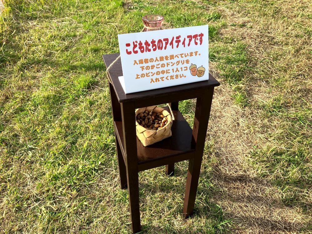 瓶の中にどんぐりを入れてもらうことで、入場者数をカウントしようという子どもたちのアイデアのようです。秋らしい仕掛けにほっこりしました。