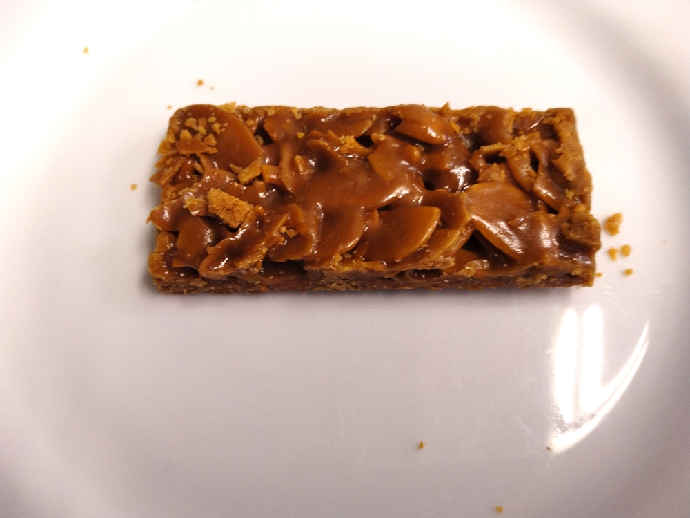 ミルフィーユ状のパイ生地の上に砕いたアーモンドが載っており、さらに上から砂糖で白いアイシングがほどこされています。