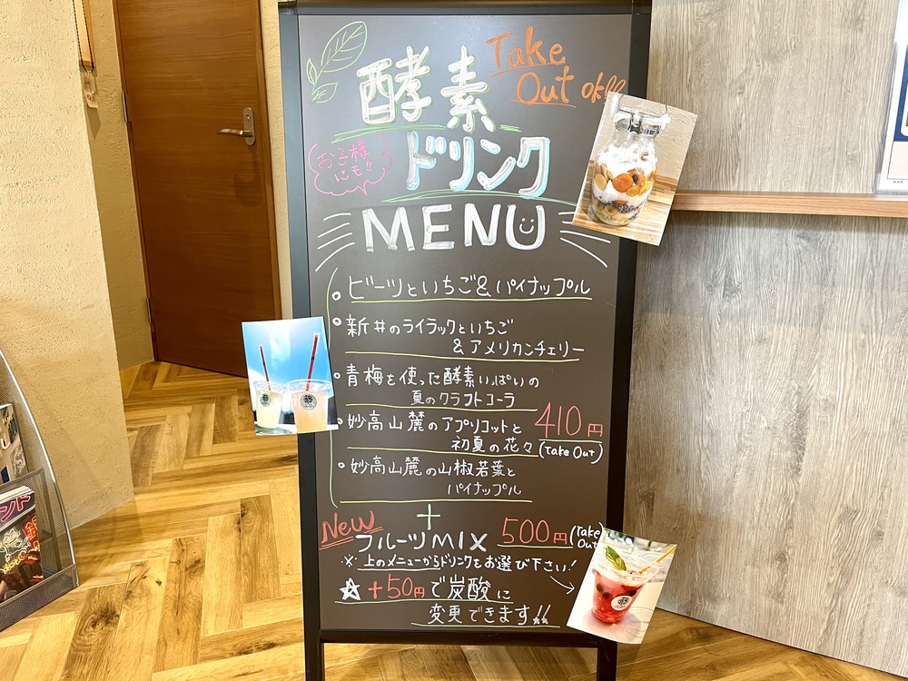レジの横には、酵素ドリンクのメニューが書かれた看板もありました。