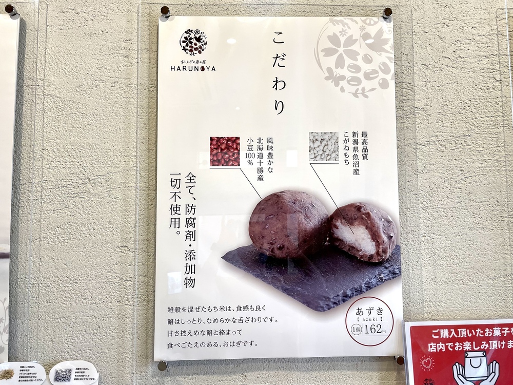 お店向かって右側の壁には、お店こだわりのおはぎの説明が書かれたパネルが飾ってありました。