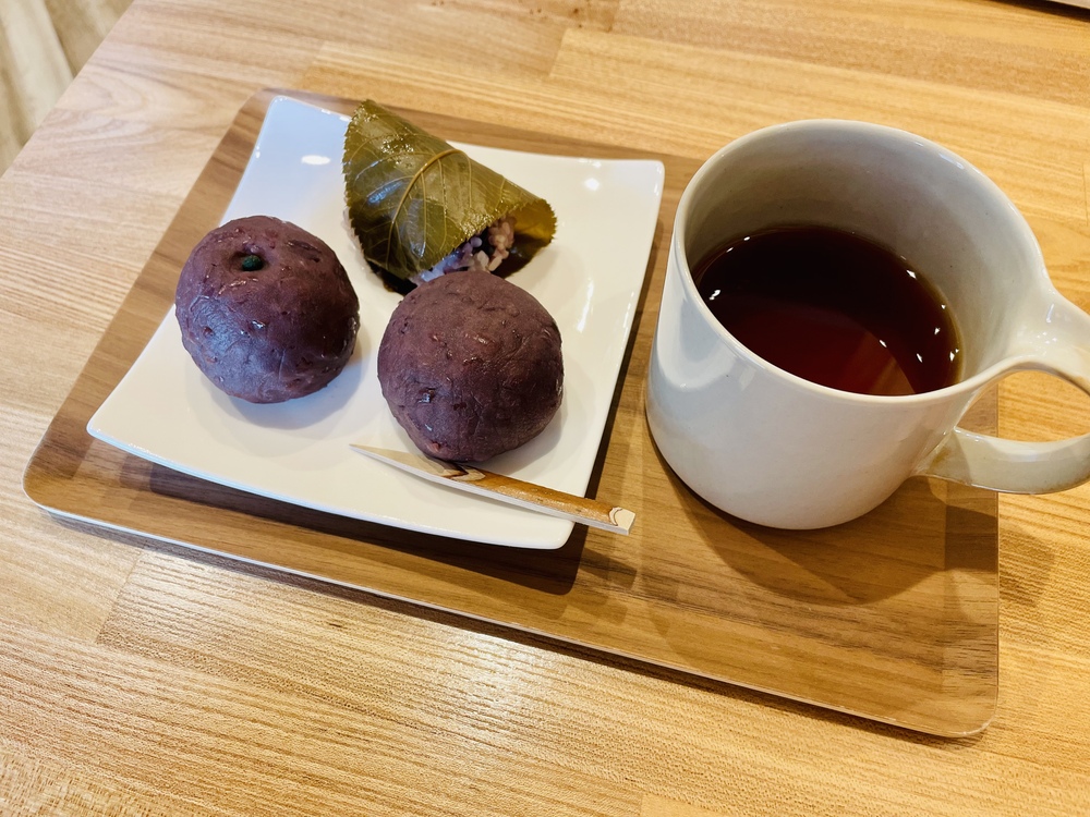 お店のイートインスペースで食べると、おはぎと一緒にお茶も用意してくれます。