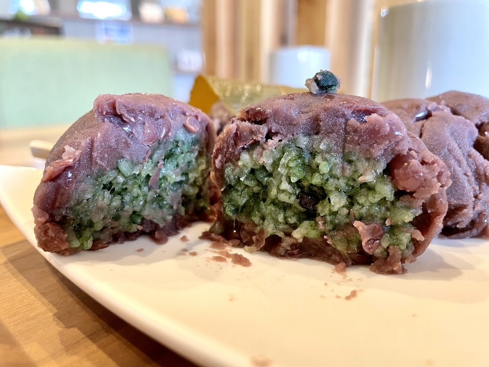 今回はお店人気1位のあずきと、店員さんがオススメしてくれた、ヨモギとさくらのおはぎの3つをいただくことにしました。